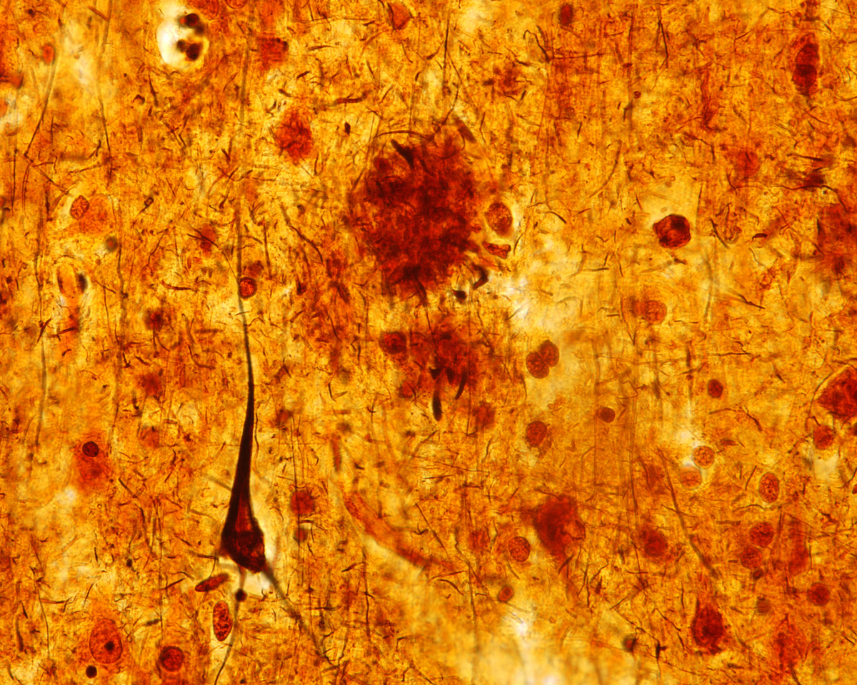 This light micrograph from the brain of someone who died with Alzheimer’s disease shows the plaques and neurofibrillary tangles that are typical of the disease. A glitch that prevents healthy cell structures from transitioning from one phase to the next might contribute to the tangles, researchers say.
