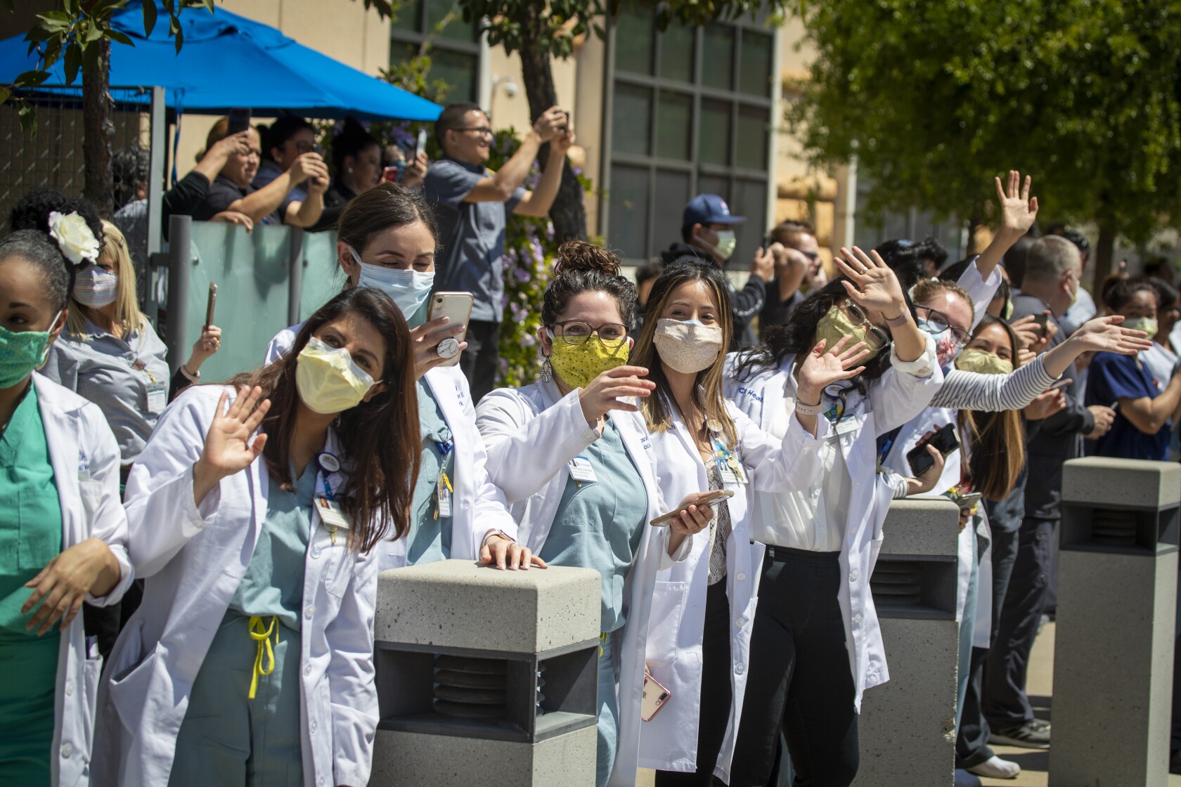 UC Irvine Medical Center healthcare workers wave as about 25 Orange County first-responder vehicles participate in a drive-by parade of gratitude as healthcare staff battle COVID-19 at the hospital.